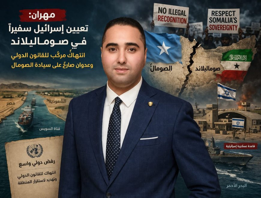 وقال الدكتور مهران في تصريحات صحفية، إن هذا التعيين يأتي استكمالاً لمخطط إسرائيلي ممنهج بدأ باعتراف نتنياهو في 26 ديسمبر 2025، تلته زيارة وزير الخارجية ساعر في يناير 2026، وقبول إسرائيل سفير صوماليلاند محمد حاجي في فبراير 2026، وصولاً لتعيين سفير إسرائيلي أمس، موضحاً أن كل خطوة من هذه الخطوات تشكل جريمة مستقلة في القانون الدولي.