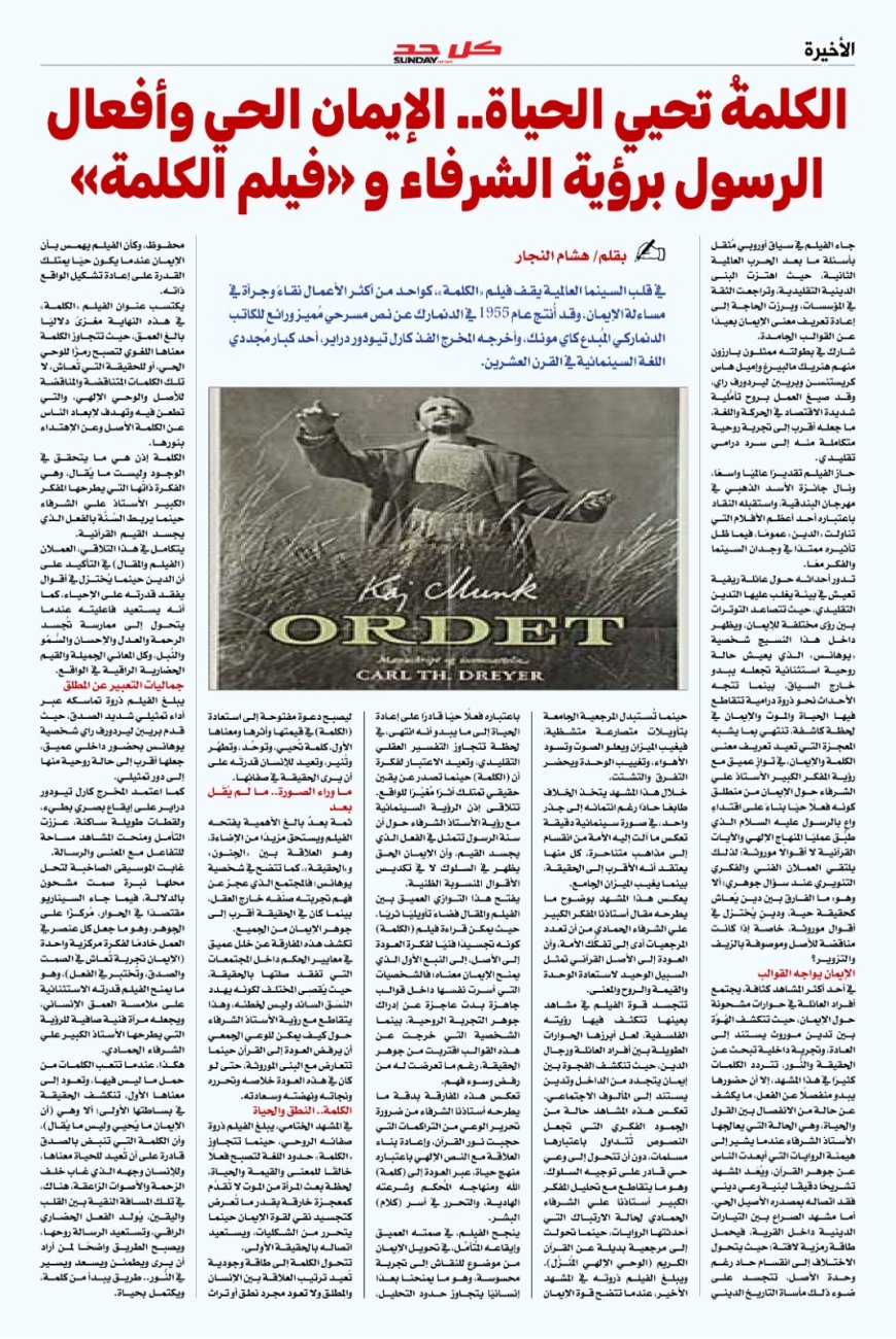 بالصفحة الأخيرة التي تشتبك مع المشهدين الفني والثقافي مقال تحليلي ونقدي لرئيس مجلس تحرير المجلة الكاتب الصحفي والأديب هشام النجار بعنوان (الكلمة تحيي الحياة.. الإيمان الحي وأفعال الرسول برؤية الشرفاء وفيلم "الكلمة"