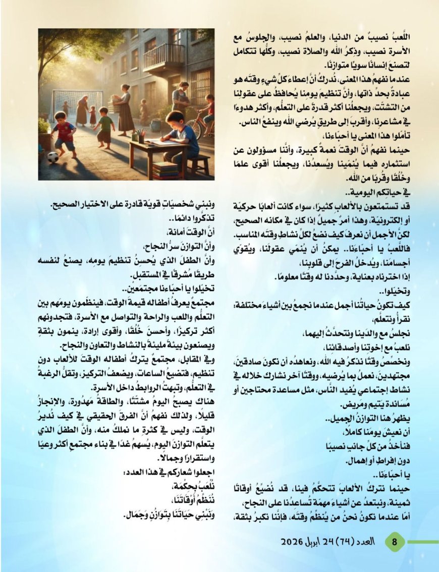 وفى فقرة اطفالنا أحبابنا موضوع جديد بقلم رئيس مجلس تحرير المجلة بعنوان (لعب بحكمة.. نبني حياتنا بتوازن وجمال)