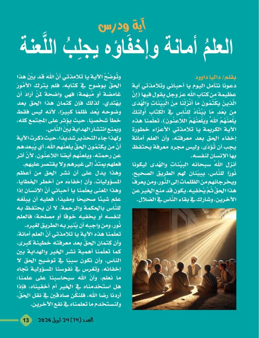 في فقرة آية ودرس موضوع جديد بعنوان (العلم أمانة وإخفاؤه يجلب اللعنة)