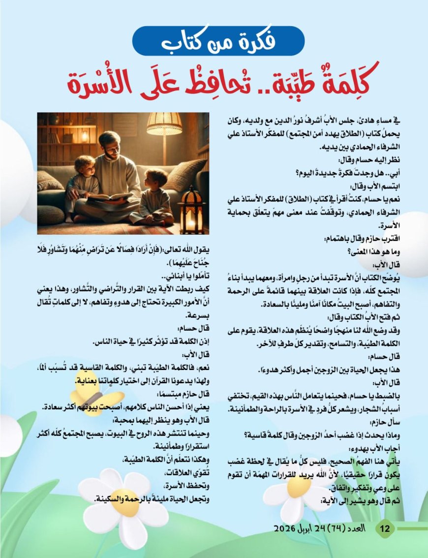 وفى فقرة فكرة من كتاب موضوع جديد بعنوان (كلمة طيبة تحافظ على الأسرة)
