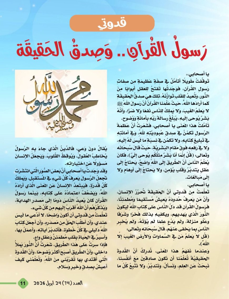 بفقرة قدوتي موضوع جديد بعنوان (رسول القرآن وصدق الحقيقة)