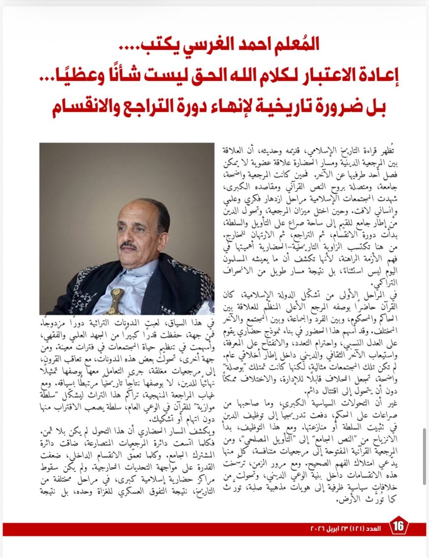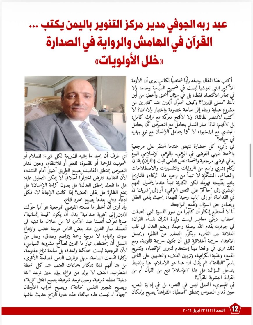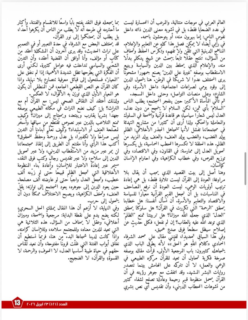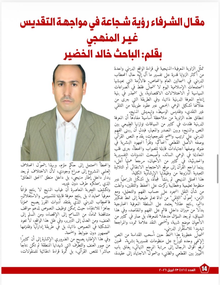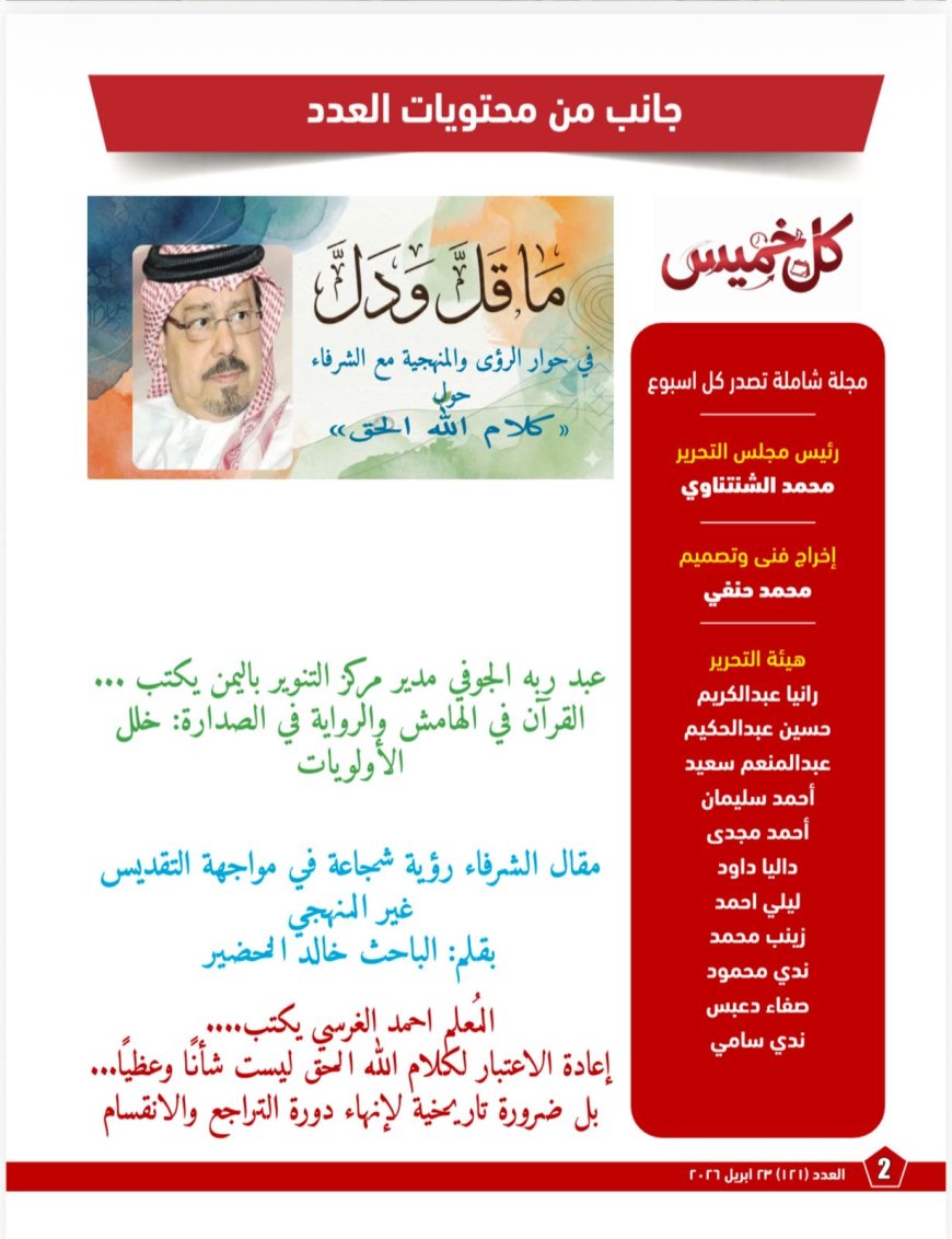 ويضم الملف أيضًا مقالًا بعنوان «مقال الشرفاء رؤية شجاعة في مواجهة التقديس غير المنهجي»، يضع اليد على جذور الأزمة داخل بنية إنتاج المعرفة الدينية نفسها؛ إذ يوضح كيف تحوّل الفهم البشري من اجتهادٍ قابلٍ للمراجعة إلى سلطةٍ معرفيةٍ مغلقة، وكيف أضعف ذلك سؤالَ المنهج لصالح ثقافة التلقي والحفظ، وفتح الباب أمام تسييس الدين وتوظيف النصوص انتقائيًا في اتجاهاتٍ متناقضة. كما يدافع المقال بوضوح عن ضرورة إعادة القرآن إلى موقع “المعيار الأعلى”، مع إبقاء التراث في موضعه الطبيعي بوصفه جهدًا تاريخيًا قابلًا للتمحيص والنقد.
