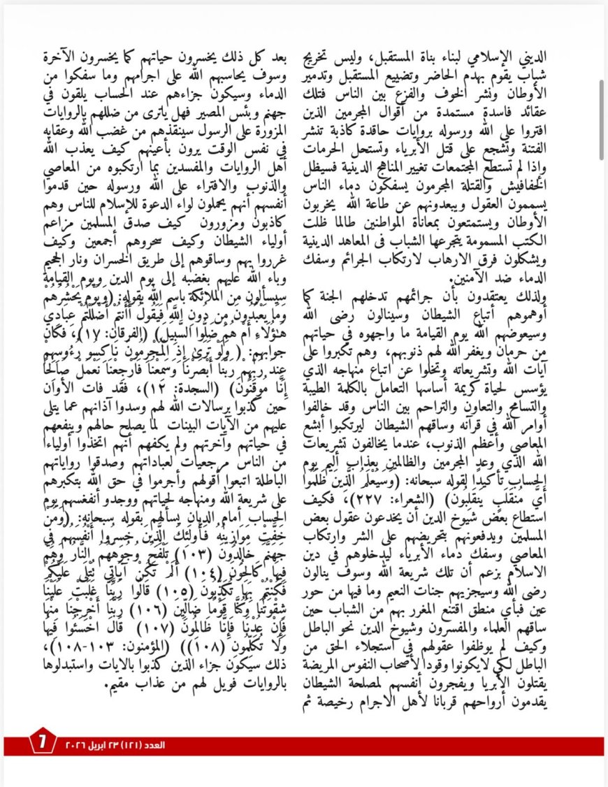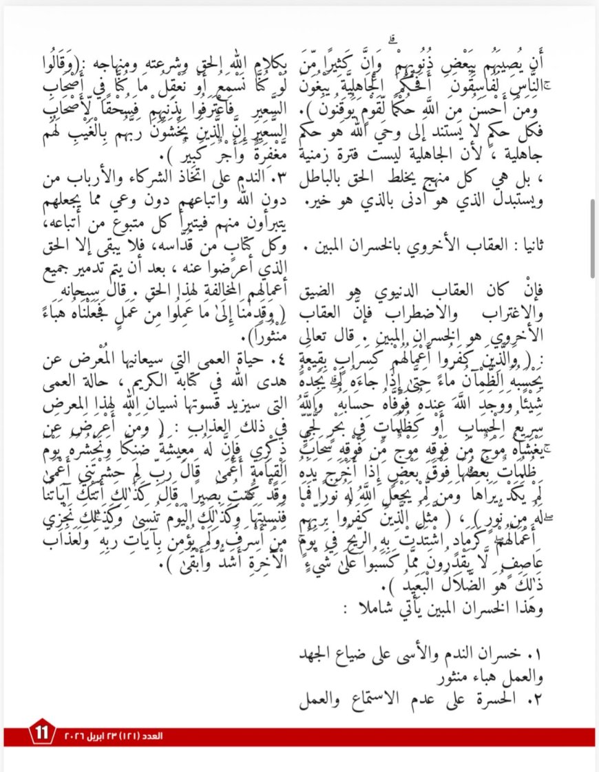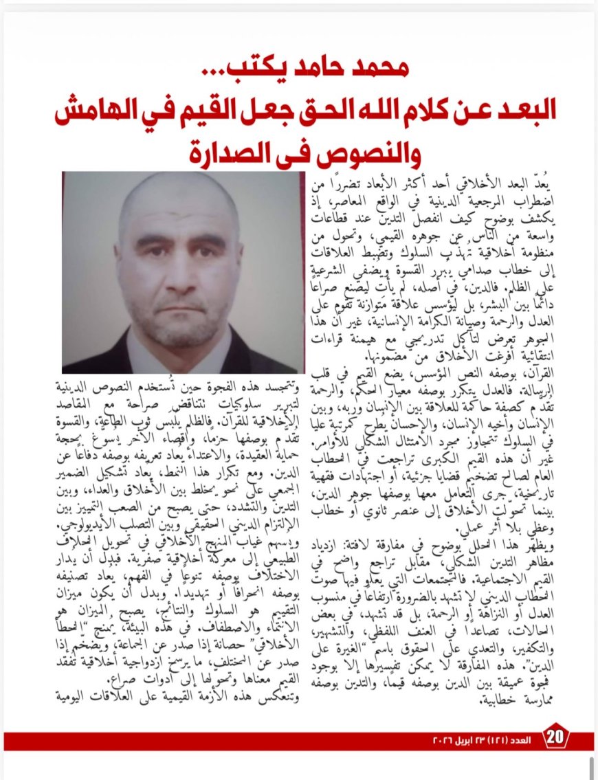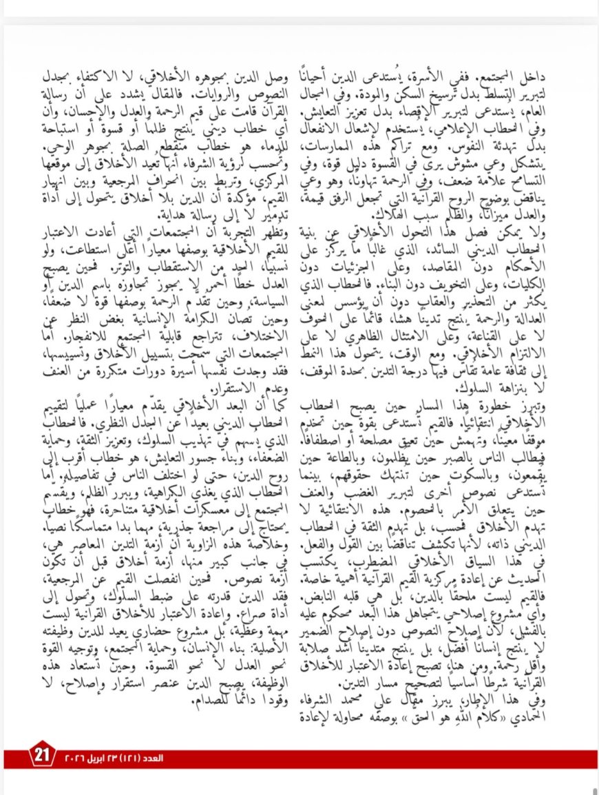 ويخصّص العدد مساحةً للبعد الأخلاقي من خلال مقال «البعد عن كلام الله الحق جعل القيم في الهامش والنصوص في الصدارة»، فيلفت إلى المفارقة التي يشهدها الواقع، حيث يتزايد التدين الشكلي في مقابل تراجع القيم الاجتماعية، ويتحوّل الدين في بعض الخطابات إلى “لغة صدام” تبرر القسوة بدل أن ترسّخ الرحمة. ويخلص المقال إلى أن أزمة التدين المعاصر هي في جوهرها أزمةُ أخلاقٍ قبل أن تكون أزمةَ نصوص، وأن أي مشروع إصلاحي لا يعيد الأخلاق القرآنية إلى المركز سيظل محدود الأثر.