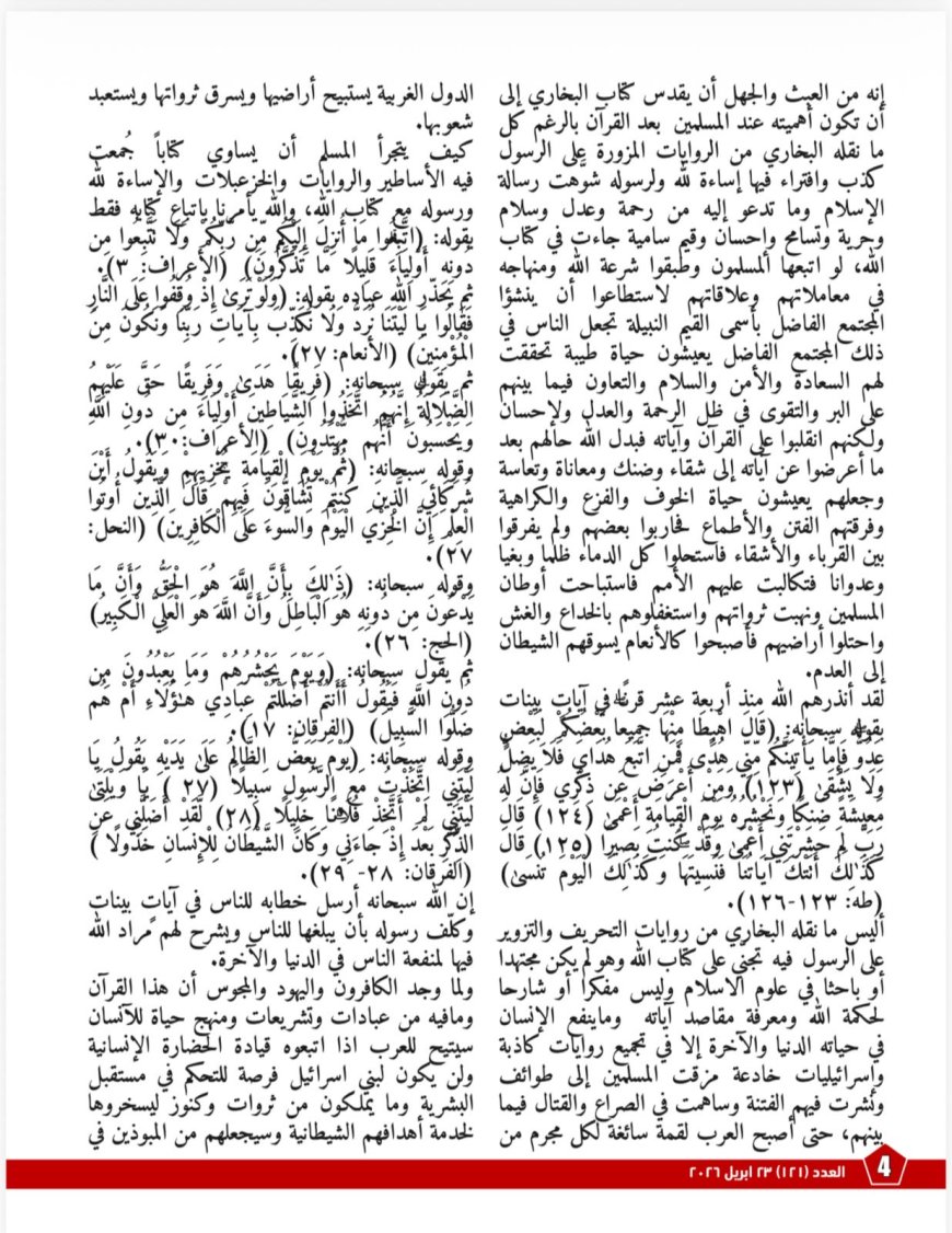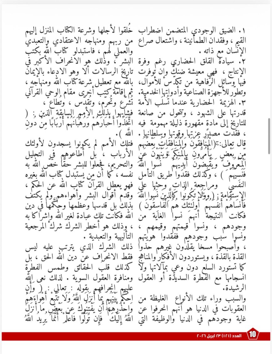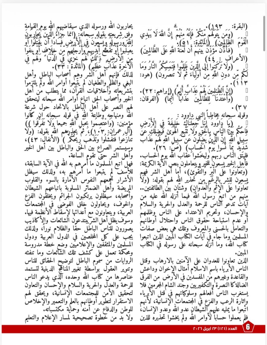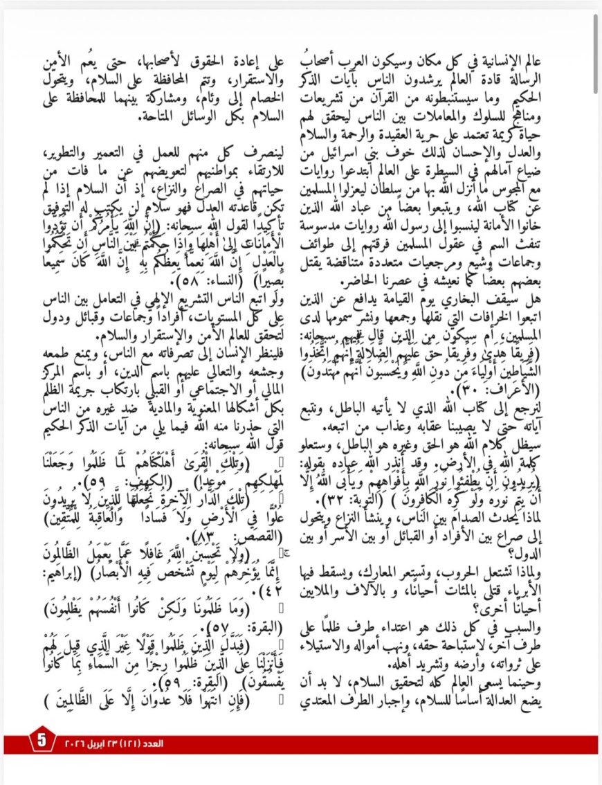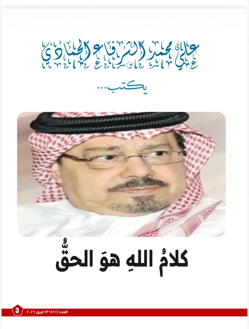 تصدر العدد مقال المفكر العربى الأستاذ علي محمد الشرفاء الحمادي بعنوان «كلامُ اللهِ هوَ الحقُّ»، ويطرح فيه رؤيةً تجعل القرآنَ الميزانَ الأعلى الذي تُوزَن به الأقوالُ والتصورات، مستندًا إلى آياتٍ قرآنيةٍ عديدةٍ تُحذِّر من الإعراض عن الذكر واتباع أولياء من دون الله.