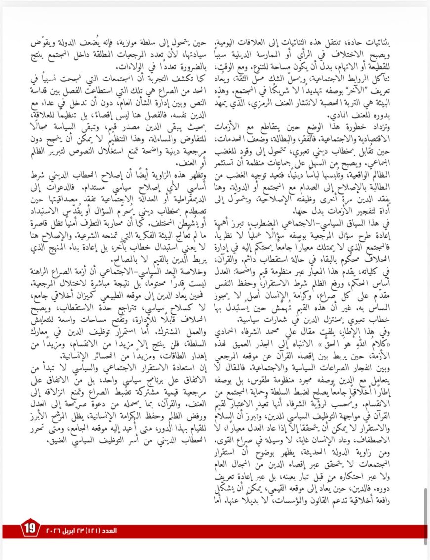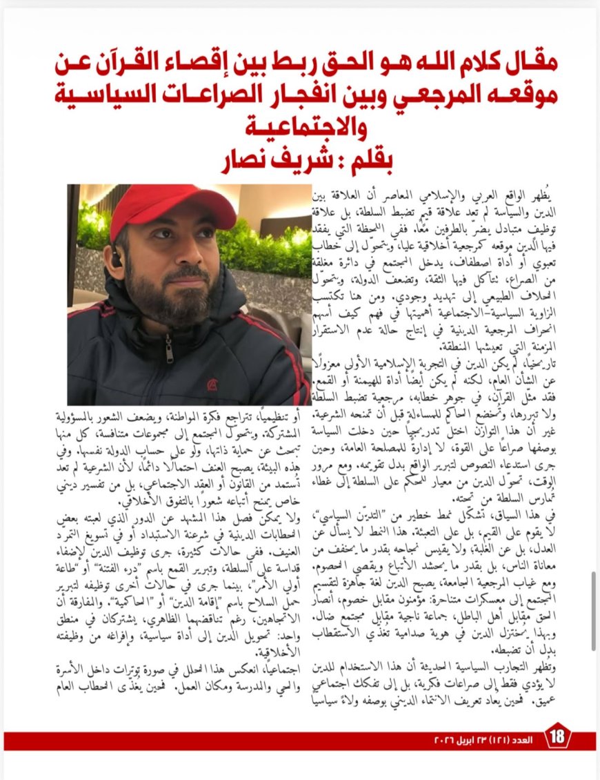 ويقدّم العدد في البعد السياسي والاجتماعي قراءةً بعنوان «مقال كلام الله هو الحق ربط بين إقصاء القرآن عن موقعه المرجعي وبين انفجار الصراعات السياسية والاجتماعية»، ترى أن الدين حين يفقد وظيفته باعتباره مرجعيةً أخلاقيةً ضابطةً للسلطة، ويتحوّل إلى أداة تعبئةٍ أو اصطفاف، يدخل المجتمع في دائرةٍ من الاستقطاب تُضعف الدولة وتفكك الروابط الاجتماعية. وتنتهي القراءة إلى أن استعادة القرآن مرجعًا قيميًا جامعًا يمكن أن تمثل مدخلًا لخفض التوتر، وإعادة تعريف العلاقة بين الدين والسياسة على أساس العدل وصون الكرامة الإنسانية.