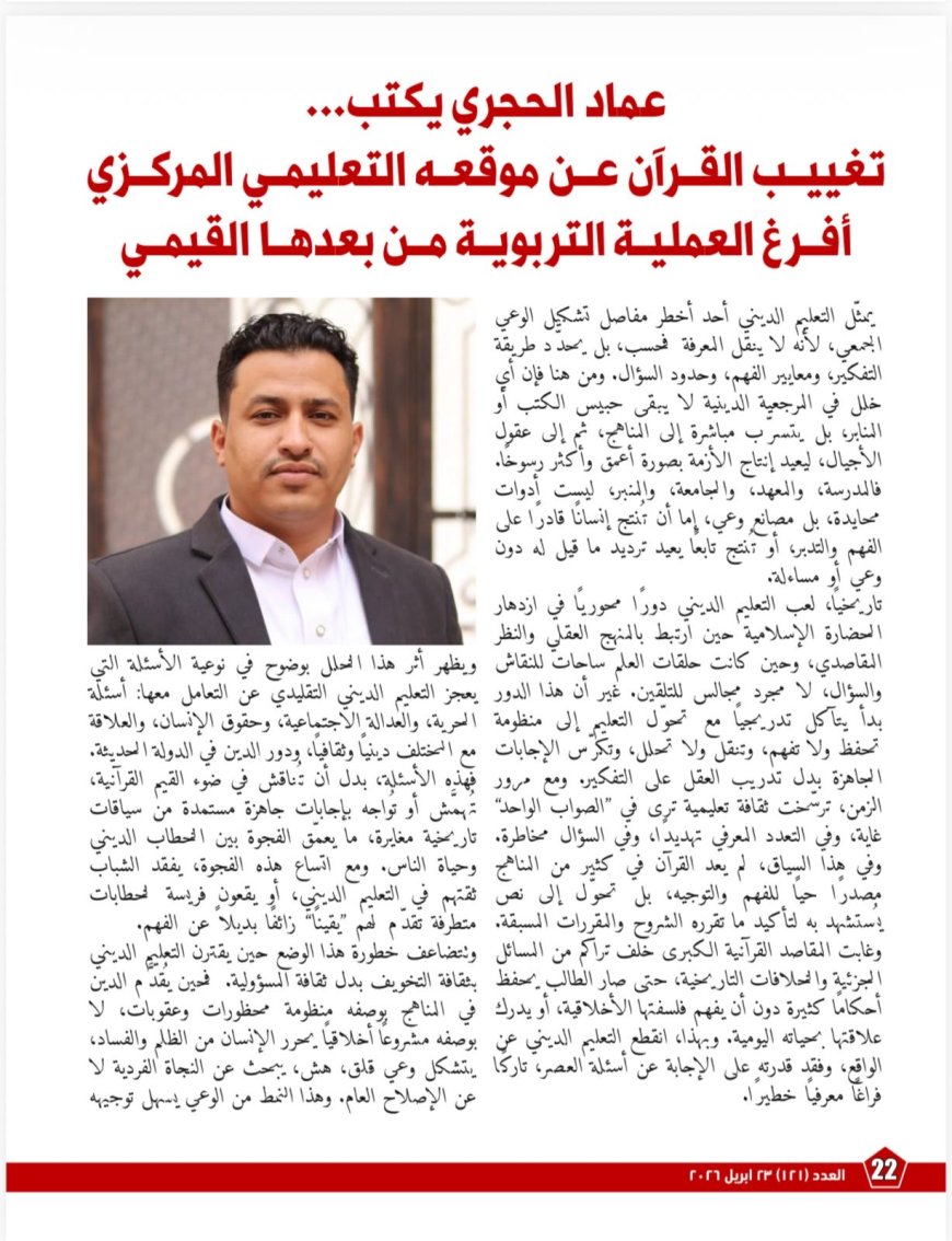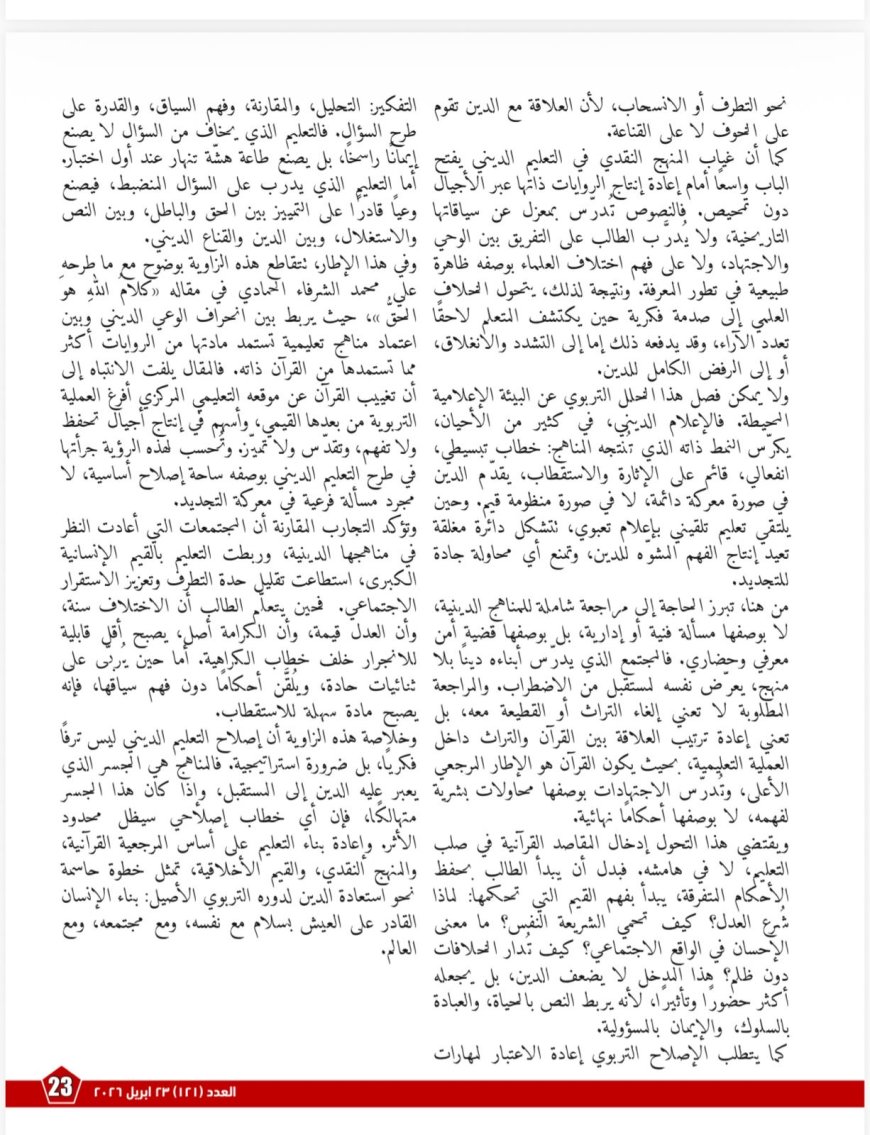 ويتناول العدد البعد التربوي في مقال «تغييب القرآن عن موقعه التعليمي المركزي أفرغ العملية التربوية من بعدها القيمي»، فيناقش أثر المناهج التلقينية التي تراكم الأحكام دون أن تؤسس منهجًا للفهم. ويؤكد المقال أن المدرسة والمعهد والمنبر تمثل “مصانع وعي”، فإما أن تصنع عقلًا قادرًا على التدبر والسؤال، وإما أن تخرّج تابعًا يخشى المراجعة. ويطرح الكاتب أن إصلاح التعليم الديني يبدأ من إعادة ترتيب العلاقة بين القرآن والتراث داخل العملية التعليمية، ومن تقديم المقاصد والقيم مدخلًا لفهم الأحكام وربط النص بالحياة.
