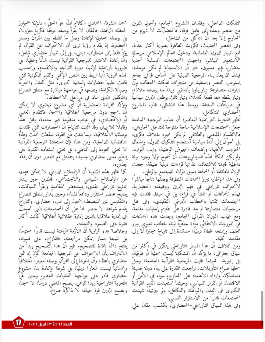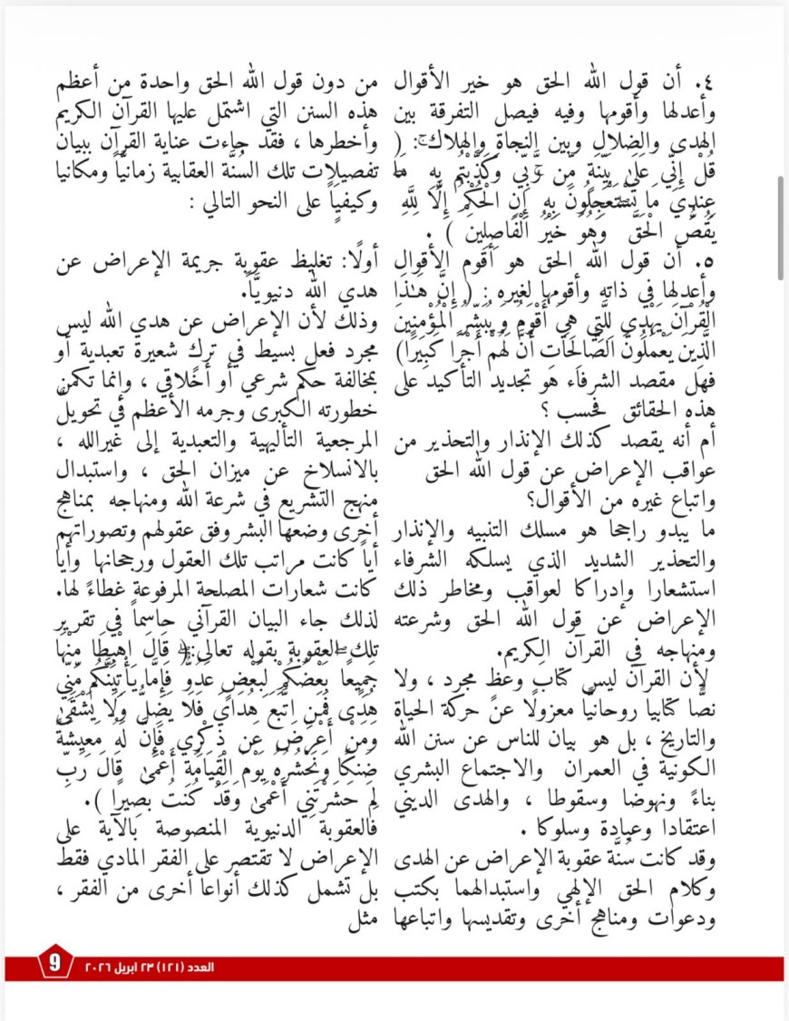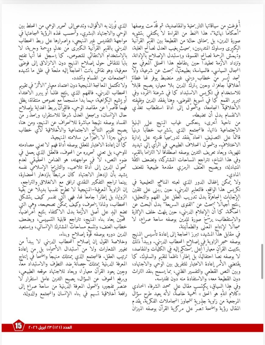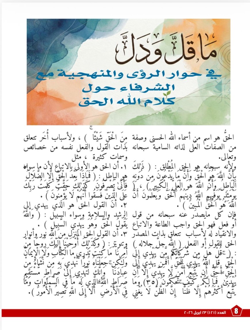 ولا يكتفي العددُ بعرض طرح الأستاذ علي الشرفاء، بل ينسج حوله حوارًا منهجيًا متعدد الزوايا، سعيًا إلى قراءة الفكرة في سياقاتها المعرفية والاجتماعية والسياسية والتربوية. ففي مادةٍ بعنوان «ما قلَّ ودلَّ… في حوار الرؤى والمنهجية مع الشرفاء حول كلام الله الحق»، يقدّم العدد قراءةً تفسيريةً تركّز على مفهوم “الحق” بوصفه اسما من أسماء الله، ثم تبين أن اتباع الحق ليس شأنًا تعبديًا فحسب، بل هو معيارٌ حضاريٌّ وأخلاقيٌّ أيضًا. كما تبرز المادة سننَ القرآن في بيان عاقبة الإعراض عن الهدي في الدنيا والآخرة، من معيشةٍ ضنكٍ وخسرانٍ مبين، وتربط ذلك بأزمات الوعي والانقسام الحضاري.